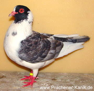 Diese 0,1 war die erste andalusierfarbige Taube, die die Hauptrassemerkmale eines Prachener Kanik aufweisen konnte. Wünsche kann man an die Farbe und die Latzgröße stellen, außerdem sollte natürlich der Oberschnabel komplett hell sein. Allerdings besitzt sie bereits rote Augen und Augenränder, eine Schnippe und auch die Zeichnung in den Flügeln ist für Prachener Kanik fehlerfrei.